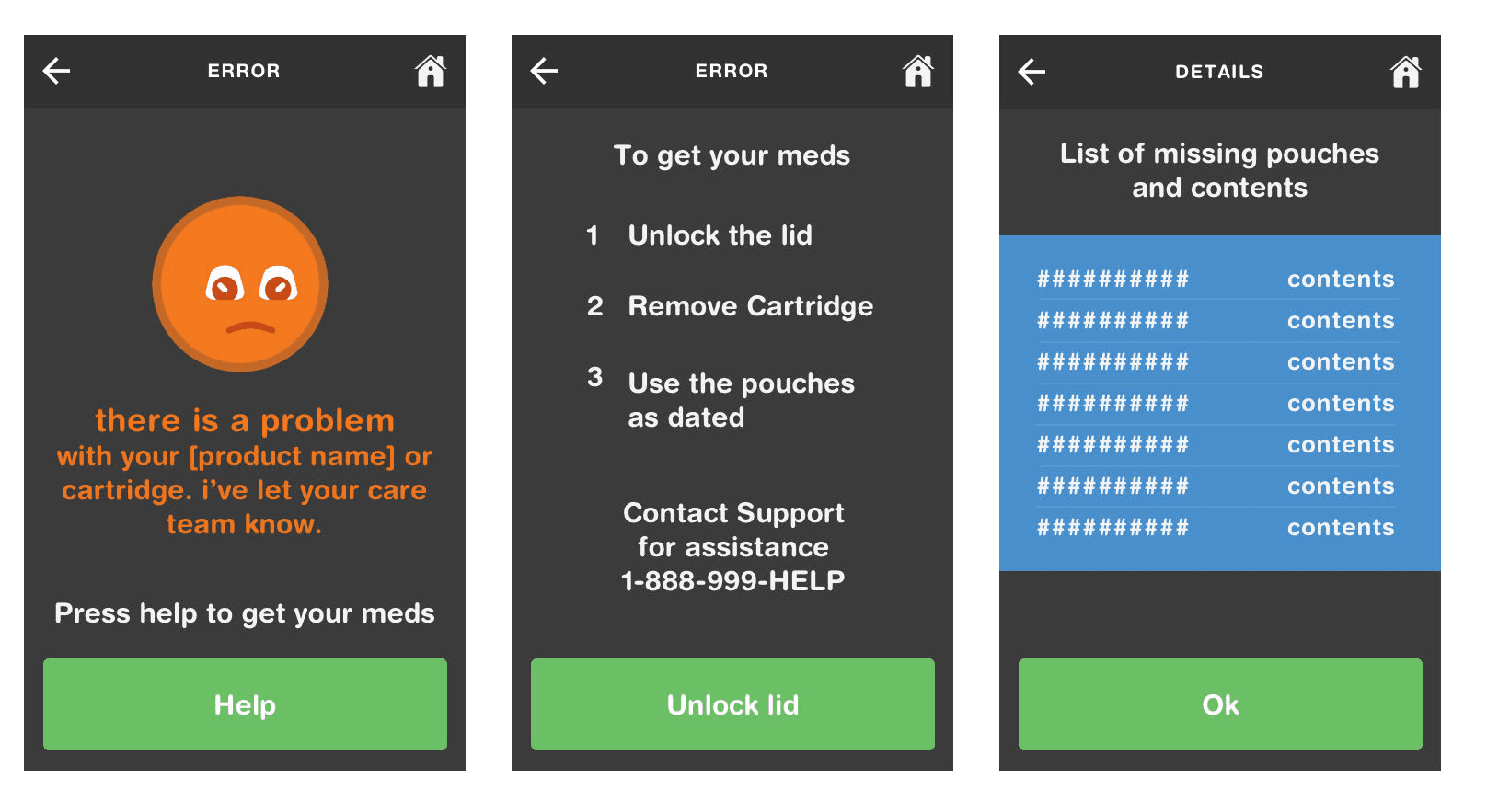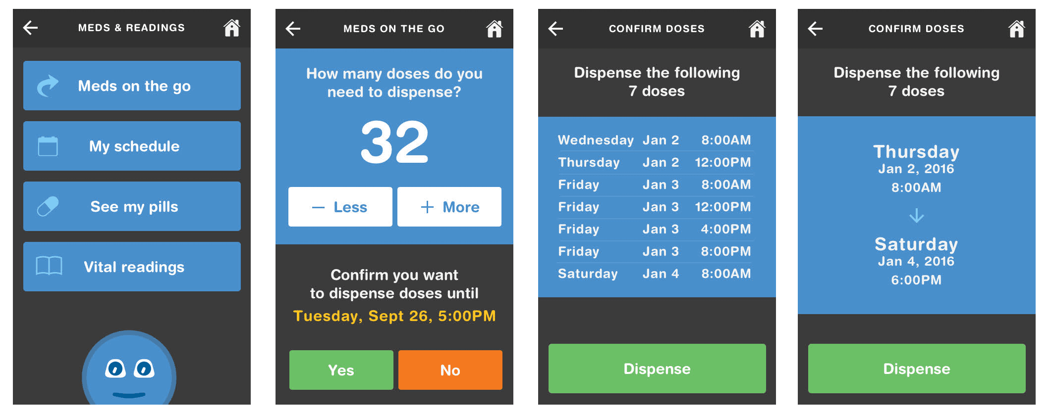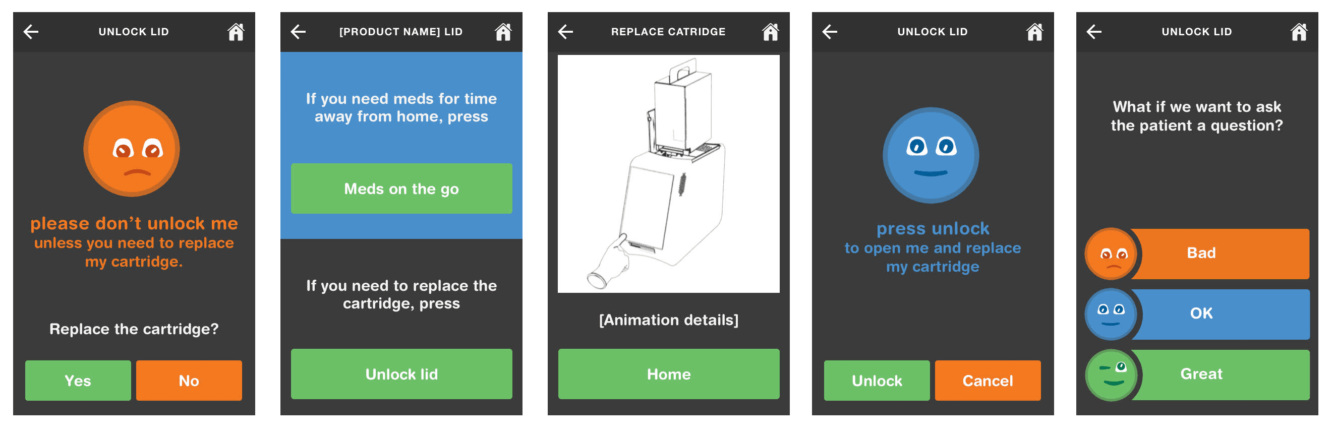 I personally designed the core UX patterns for the device's medication confirmation flow, setting the standard for the rest of the UI library.