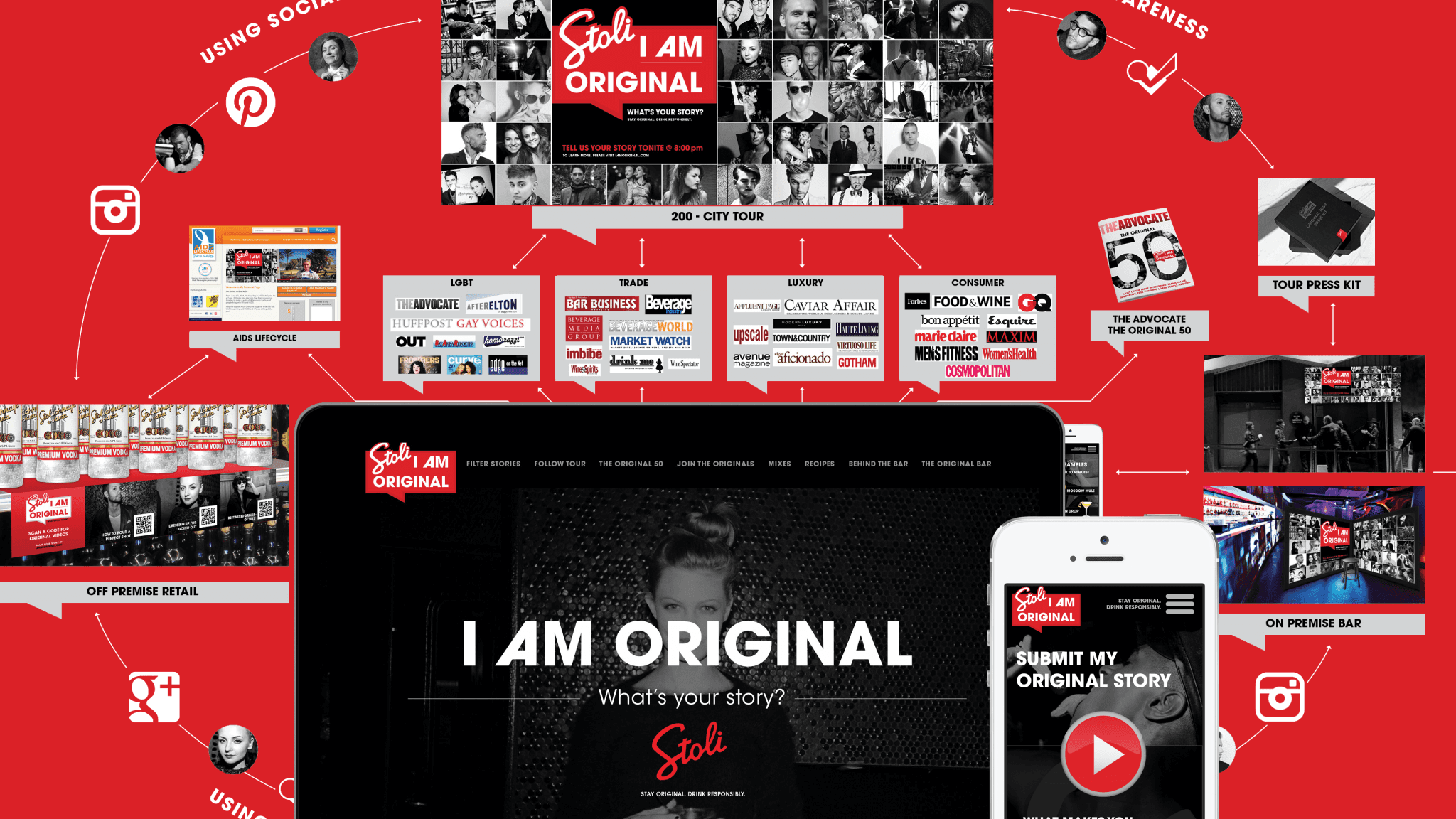 To answer a high-stakes RFP for Stoli, I led the creative strategy and design execution for a multi-channel campaign aimed at reclaiming the brand’s status within the LGBT+ community. By centering the narrative on the theme of “Originality,” we created a platform that celebrated individuality and pride through a blend of user-generated content, immersive experiential activations, and a robust digital ecosystem.