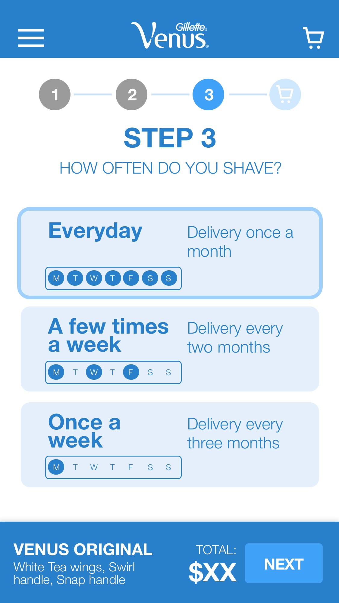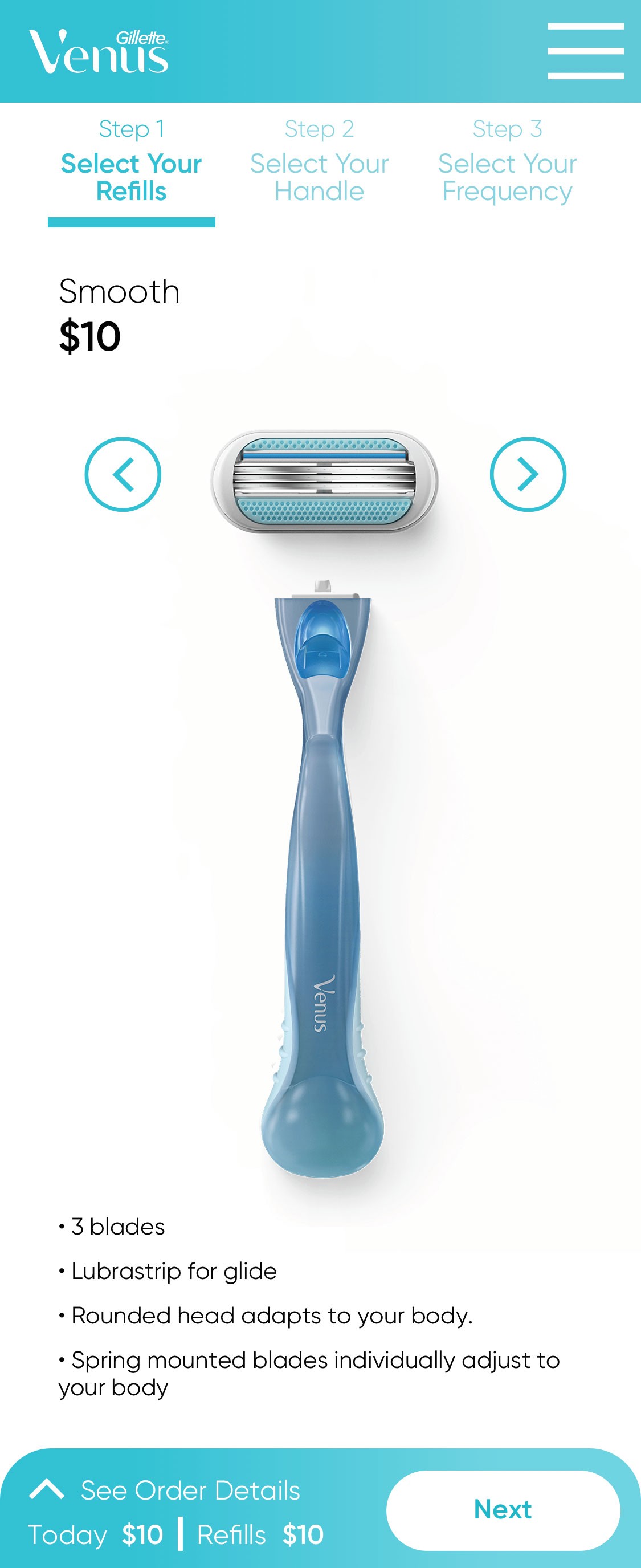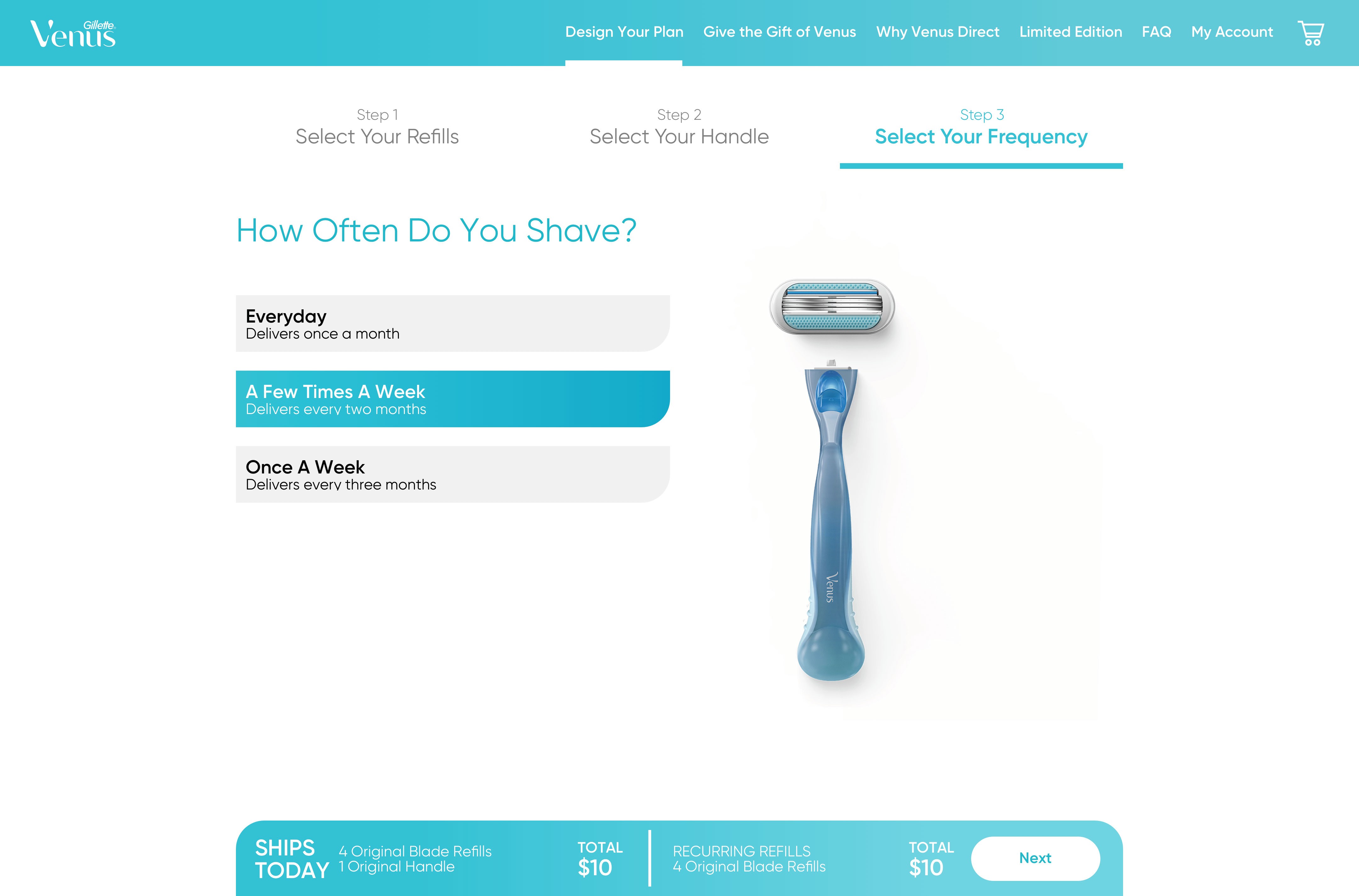 Developed a step-by-step modular flow (Select Refills → Choose Handle → Set Frequency) to prevent cognitive overload.